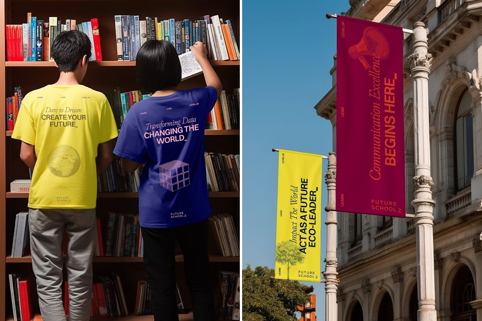 此外,未來學(xué)校AI還采用了飽和的原色調(diào),這種顏色的組合賦予品牌活力與熱情,能夠引發(fā)年輕人對學(xué)習(xí)的興趣和熱情。同時,深色的飽和色調(diào)則傳達(dá)了品牌的聲望與追求卓越的氣質(zhì),使品牌形象更加穩(wěn)重、專業(yè),同時不失活力與創(chuàng)意。